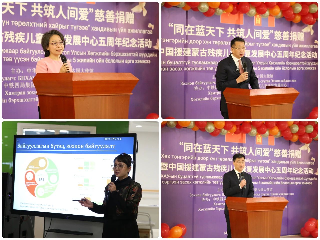 10月31日,驻蒙古使馆会同蒙古残疾儿童康复发展中心(以下简称“中心”)、中铁四局共同举办“同在蓝天下 共筑人间爱”慈善捐赠暨中国援建中心五周年纪念活动,沈敏娟大使、蒙古劳动与社会保障部长恩赫阿木古楞、中心院长乌冈其其格、联合国驻蒙协调员米斯拉等出席。